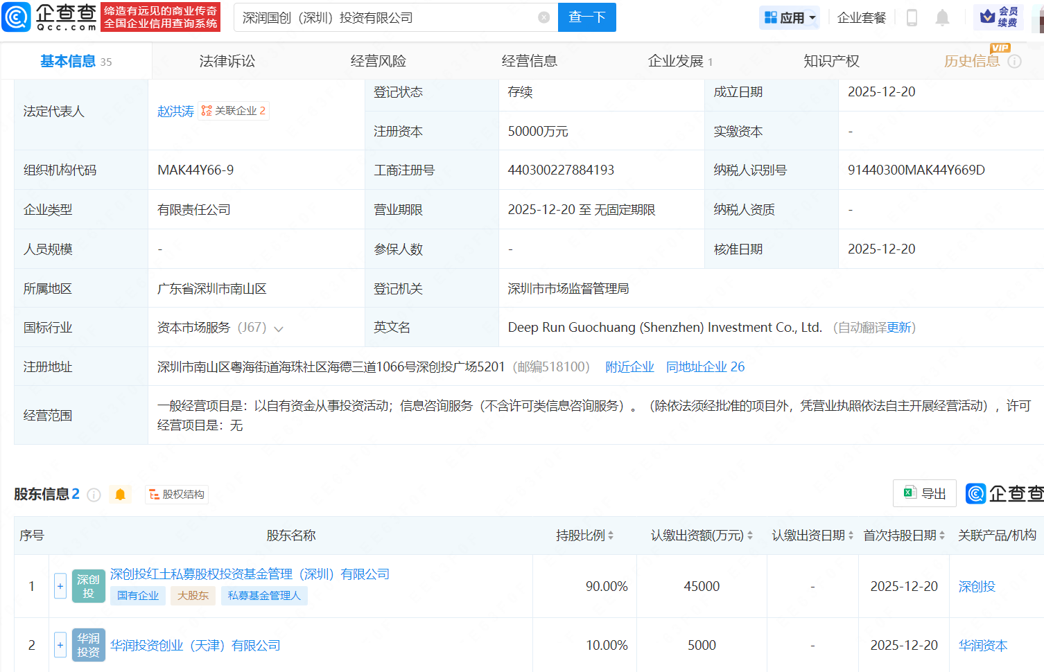 近日,深润国创(深圳)投资有限公司成立,法定代表人为赵洪涛,注册资本5亿元,经营范围为以自有资金从事投资活动、信息咨询服务。企查查股权穿透显示,该公司由深创投红土私募股权投资基金管理(深圳)有限公司、华润投资创业(天津)有限公司共同持股。